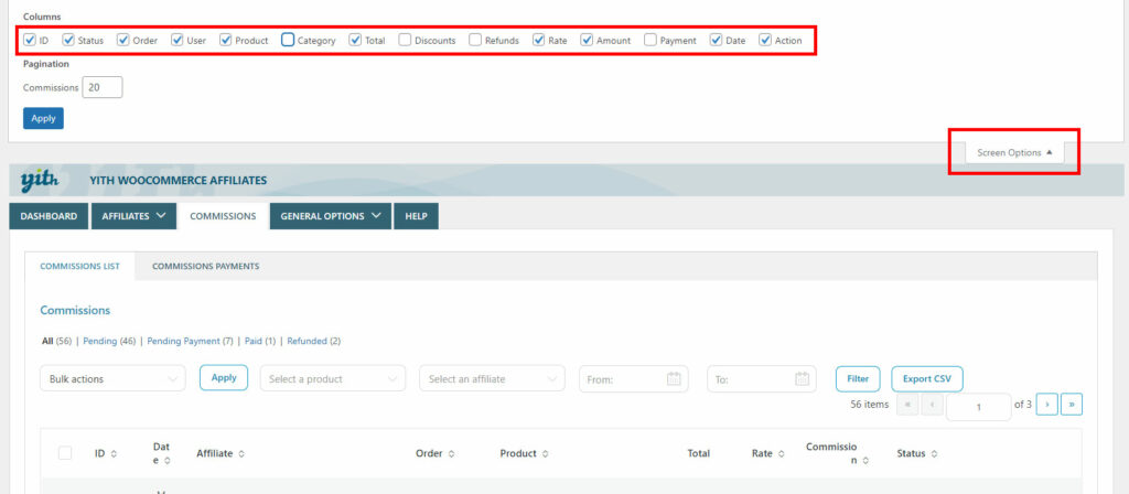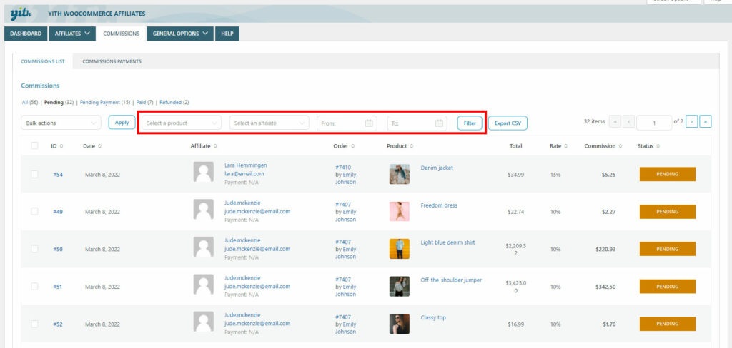 コミッションのステータスに基づいて、上部のフィルターを使用してコミッションのビューをフィルターしたり、保留中のコミッションまたは支払い済みのコミッションのみでフィルターしたりすることができます。