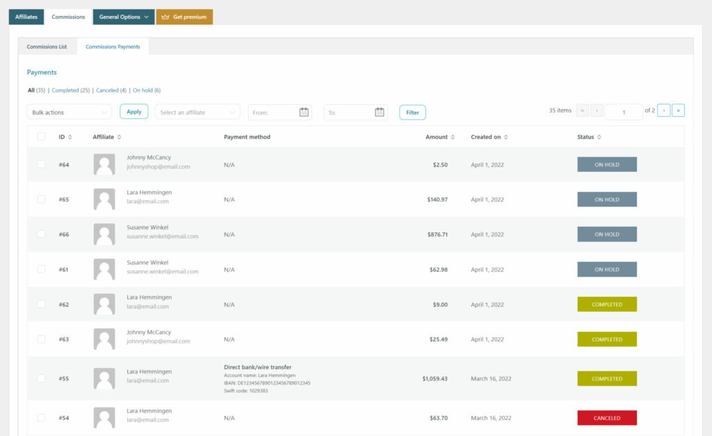 この画面から、ステータス、アフィリエイト、日付別に支払いをフィルタリングすることもできます。