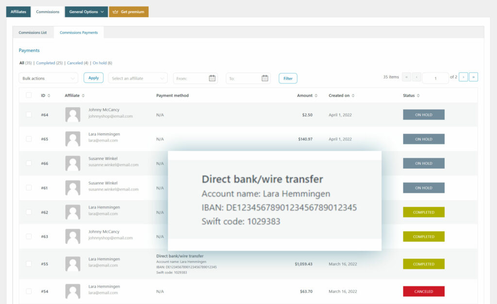 支払い記録が作成されたら、オフラインでアフィリエイトに支払いを発行し、支払いステータスを [完了] に変更できます。リンクされたすべてのコミッションは自動的に [支払い済み] ステータスになります。